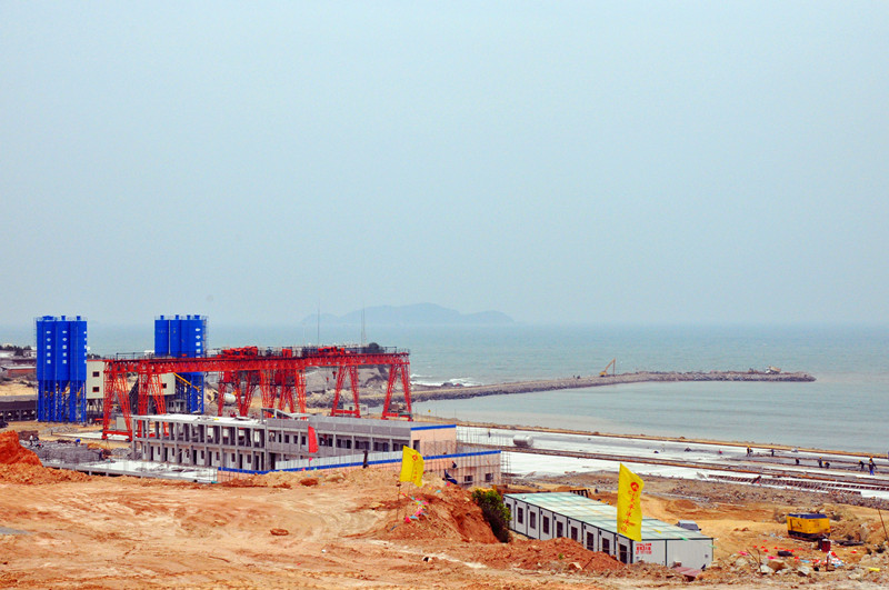 東防波堤工程全長(zhǎng)5423米,西防波堤工程全長(zhǎng)3315米,口門寬度600米?陂T堤頭段采用直立式沉箱結(jié)構(gòu),其他堤身段采用拋石斜坡堤結(jié)構(gòu),共需拋填各類石料1060萬(wàn)m3,澆筑混凝土82.6萬(wàn) m3,項(xiàng)目總投資為25.45億元,建安費(fèi)17.94億元。東西防波堤建成后,形成港池面積6平方公里,岸線10850米,可建3-30萬(wàn)噸級(jí)泊位30-35個(gè),設(shè)計(jì)吞吐量2億噸。
