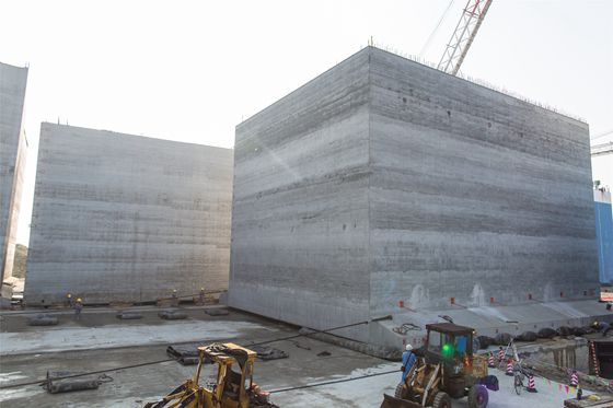 據(jù)介紹,博賀新港區(qū)防波堤堤頭采用重力式沉箱結(jié)構(gòu),其余段均采用斜坡式拋石結(jié)構(gòu)。所謂沉箱,就是構(gòu)成碼頭的基礎(chǔ)部件,是一個立方體巨型箱子,其中間由隔墻將其分為24個倉格,每個倉格的內(nèi)部中空,沉箱在水上有一定浮力,可以使用船機設(shè)備拖拽運輸進行安裝。沉箱沉入水中后,將回填塊石到每個倉格中進行充實,沉箱填充滿塊石后,重量將達到20000噸左右,使用體量如此巨大的沉箱作為防波堤堤身結(jié)構(gòu),堪稱防波堤建設(shè)的“定海神箱”,千百年守護著博賀新港區(qū)的安全運營