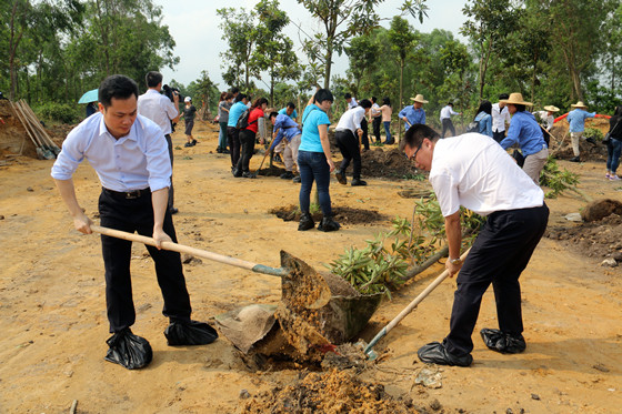 由于連日多雨天氣,植樹現場土地泥濘,但絲毫不影響集團員工的勞動熱情。大家扶苗、揮鏟、培土,現場一派熱火朝天的景象。短短一個小時,數十棵樹苗迎風挺立,扎根在這曾為茂名工業(yè)發(fā)展做出巨大貢獻的土地上,把露天礦生態(tài)公園裝點得更加生機盎然。