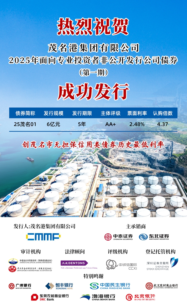 4月17日,茂名港集團成功發(fā)行2025年度“25茂名01”公司債券。本期債券發(fā)行規(guī)模為6億元,債券期限為5年期,最終票面利率定格在2.48%,全場認購倍數(shù)4.37倍,本期債券由中泰證券股份有限公司擔任簿記管理人。