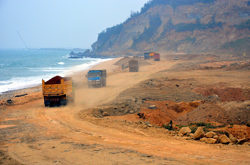 博賀新港區(qū)西防波堤施工便道建設(shè)現(xiàn)場(chǎng)