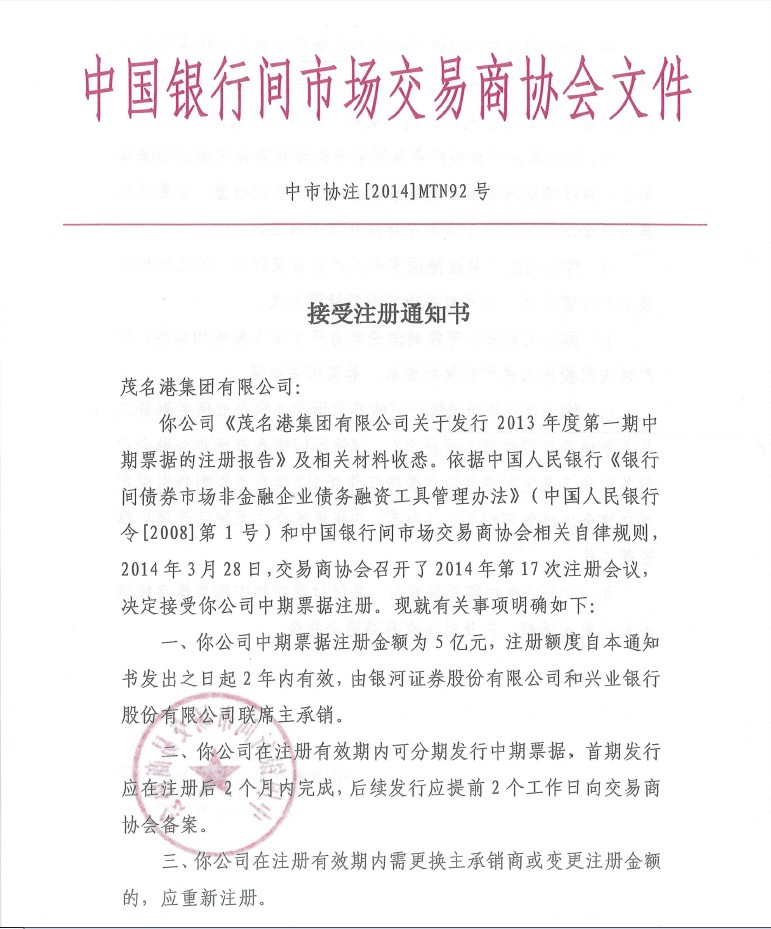 4月14日,茂名港集團(tuán)收到中國(guó)銀行間市場(chǎng)交易商協(xié)會(huì)下發(fā)的《接受注冊(cè)通知書(shū)》,交易商協(xié)會(huì)正式?jīng)Q定接受茂名港集團(tuán)注冊(cè)發(fā)行5億元中期票據(jù)。這不僅為茂名港口項(xiàng)目的建設(shè)提供了堅(jiān)實(shí)的資金保障,而且開(kāi)創(chuàng)了茂名地區(qū)企業(yè)融資創(chuàng)新的先河,將對(duì)茂名市企業(yè)開(kāi)拓直接融資市場(chǎng)具有重大影響。